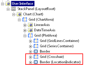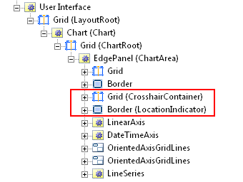 </ControlTemplate>I have indicated the location where I add my own visual content and also the location where the chart control adds the axes. The resulting visual tree is shown below: