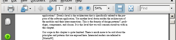 This is a screen capture of a PDF displayed in Adobe Reader. Notice how the drop shadow under the control bar at the top result in our instinctively understanding that the pages will go "under" the control bar. The interface's behaviour would be acceptably clear without the drop shadow, due to the positioning of the scrollbar indicating the pages will scroll but not the control bar, however, the natural interpretation would be that the pages magically disappear off at the top. Although users are probably accustomed to this idea through general computer use, the "goes under" concept is understood more instinctively as it is more natural.