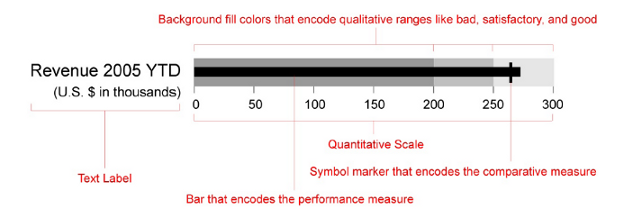 Moving on to considering the techniques and practices that will improve dashboard design, the core idea was once again Tufte's "data-ink ratio" argument: "reduce the non-data ink; enhance the data ink". A number of objectives specifically for the visual design of dashboards were also prescribed: eliminate clutter and distraction, group data into logical sections, highlight what's most important, support meaningful comparisons and discourage meaningless comparisons. Each of 6 categories of dashboard display mechanisms (graphs, icons, text, images, drawings and organisers) was considered with the aim of achieving these goals. The most time was spent addressing graphs; re-iterating some of the previous day's content and introducing a couple of graph types more specifically designed for the dashboard context: bullet graphs (see image below) and sparklines. Bullet graphs are Stephen Few's own development to address the requirement (unfortunately) usually fulfilled using gauges, i.e. the display of a single quantitative value against one or more comparative measures within the context of some qualitative ranges, e.g. poor, satisfactory, good. The benefits that bullet graphs have over gauges are numerous, but in particular they take up significantly less space and are more conducive to the aforementioned objectives. Sparklines, on the other hand, were introduced by Tufte in his book The Visual Display of Quantitative Information, and are designed to present trends or variations in a simple, space-saving way.