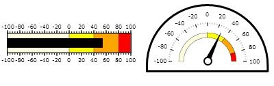 The code for creating the major / minor ticks and qualitative ranges are much the same as before. However, for a bit of variation I did not want the labels on this gauge to be rotated. In order to achieve this I used the same technique as before where each label is initially constructed at the same location, then a translate / rotate transform is used to move it to the correct location on the dial. In this control, the text label is rotated a second time in the opposite direction in order to bring it back to its original orientation: