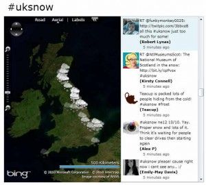 The application below gives a real-time view of the snow across the UK. To add a snow report to the map, tweet #uksnow with your postcode and the amount of snowfall out of ten (e.g. 7/10).