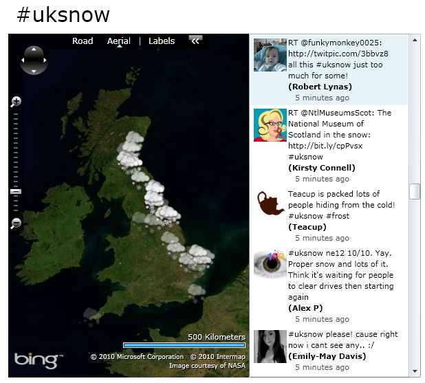 With the heavy snow in the UK, I was inspired to have a go at creating a Silverlight version of Ben Marsh's UKSnow twitter / maps mashup.