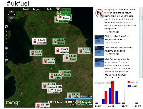 A few weeks ago I blogged about a Twitter / Bing Maps mashup that I had created for tracking snowfall in the UK via the #uksnow twitter hashtag. Last week I spotted a number of people in the uk who were using a new hashtag #ukfuel for tweeting fuel prices together with a postcode to indicate its geographic location. With a few tweaks I was able to modify my mashup to plot fuel prices instead of snowfall.