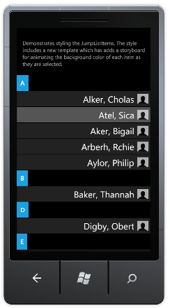 The main difference between the JumpList and a ListBox is that a JumpList requires that you supply a CategoryProvider. In the example above an AlphabetCategoryProvider was supplied which groups the supplied objects (in this case Person instances) based on the first letter of the property indicated by the PropertyName of the AlphabetCategoryProvider. In this example, the items are being grouped by the Surname property.