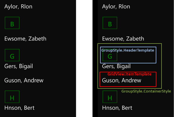 </GridView.GroupStyle>This rather complex block of XAML is composed of three parts, the best way to understand how they relate to the rendered output is via a picture: