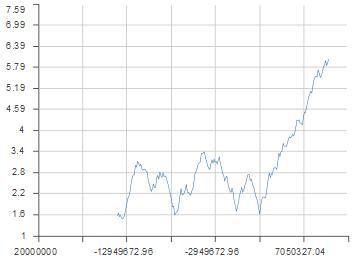 These problems are solveable, however, without writing a new axis class from scratch, the best you can do is to be able to determine the values for the start and end labels and configure the number of steps to use inbetween. This might not seem like much of a draw back, but consider the time axis on this chart; the time range is always the same - 8.00am till 4.30pm (the time that the fake exchange is open), and we'd like to put labels at sensible points in time and not too often. However, we can't set the gap between values to be say two hourly because the time difference is 8.5 hours which isn't divisible by 2. Therefore, we are forced to set the time gap to half an hour then add a bit of a kludge so as to only render labels at sensible gaps. The result looks ok, but it would be nice to be able to do it with fewer vertical lines!