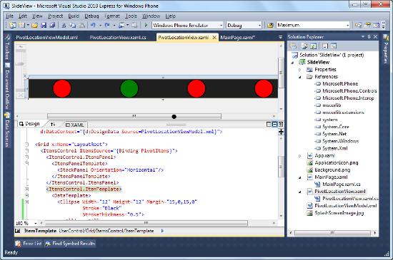 The control that displays the location pips is defined in XAML, with the relationship between this control and the Pivot created via an ElementName binding: