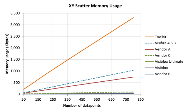 - Scatter Series Memory Usage - the above test is re-run, but this time rather than measuring render frame rate, the memory consumed as a result of adding the datapoints is recorded.