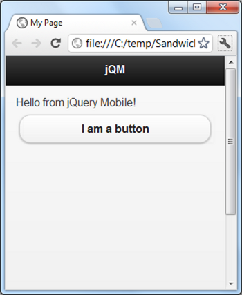 Considering that jQM is all about styling, why do we have JavaScript files as well as CSS files in our project? If you look at the source of the rendered page, you will see why. The simple button in our source HTML is now the following: