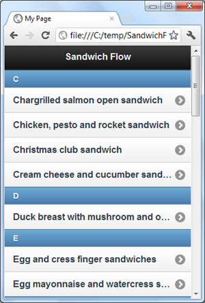 I'll re-use the data I collected for my SandwichFlow application to create a HTML5-based webpage where you can browse sandwich recipes. The index page is simply a list of sandwiches, sorted alphabetically: