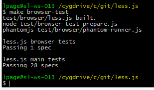 I started by making up a test page and running it locally. Immediately I hit the problem that for security reasons you cannot do an XHR request on the filesystem. In IE you have to use a different mechanism which less.js doesn't yet support and in chrome you have to pass a command line parameter (--allow-file-access-from-files) to enable it. So, probably, not too many people are using less.js this way and I found some problems with enabling it in PhantomJS.