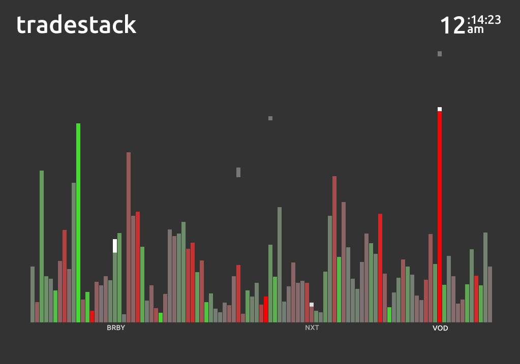 In this application, each bar represents the trading volume for a stock, using the WebSocket API, it is notified of live incoming trades which are represented as falling blocks. When the blocks reach the top of their bars, they flash white, the labels shows up, then they fade away and are absorbed. The colour of each bar represents the difference between the average trading volume and the current trading volume up to that point in the day.