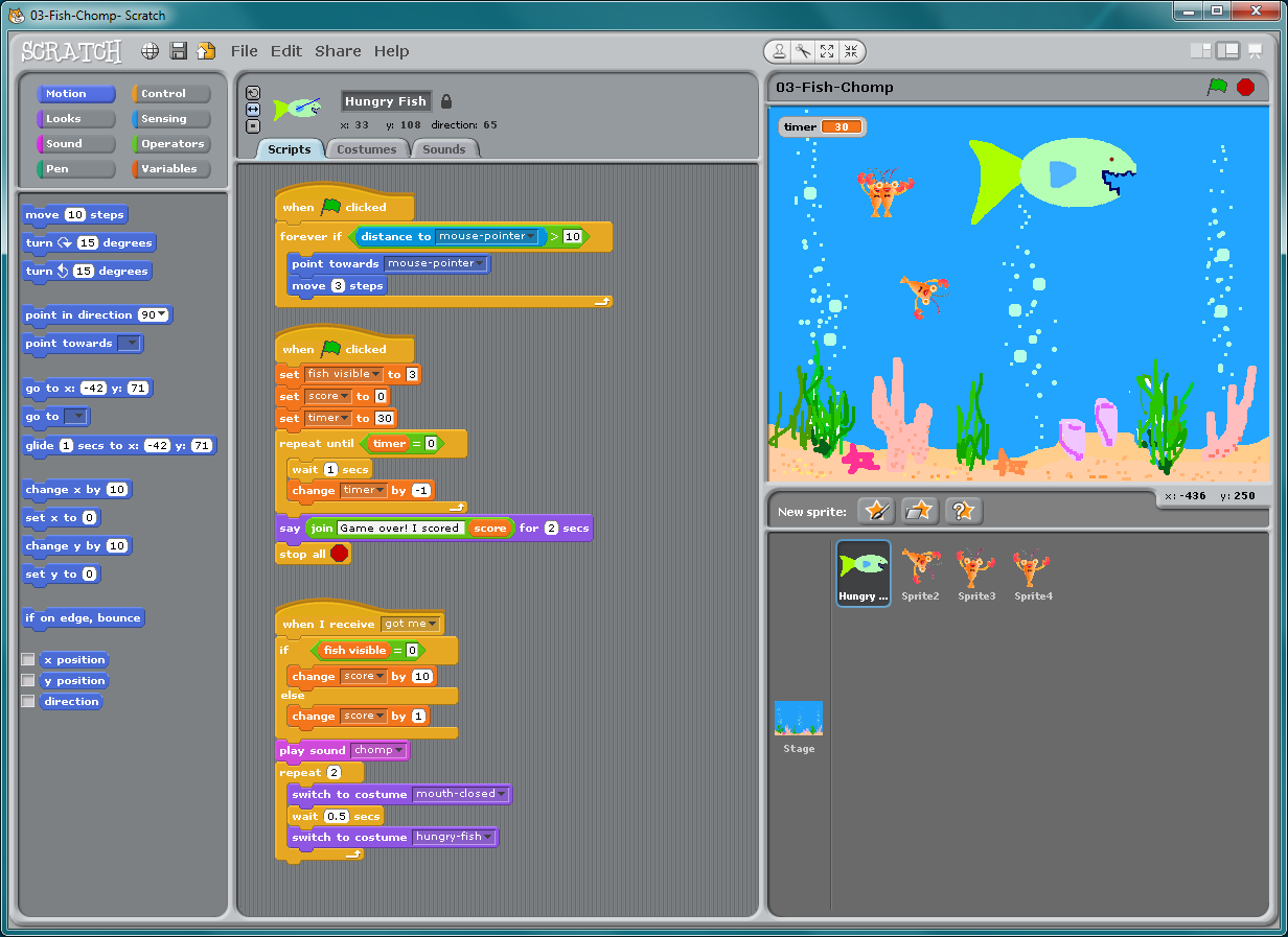 Have fun! Code Club can be hard work, so take a step back and enjoy it! Give the students time to play the games they create, especially when they need two players! The students will quickly come up with new ideas and begin implementing them! Students will also want to put their own spin on the games. Wherever possible, allow them to do so. It’s not always possible to deviate from the lessons, such as with Fish Chomp (collision detection is performed on a fish’s teeth, which is not possible on all sprite images), so be aware of where the students will have to be more constrained. If they’re having fun, you’ll be having fun and they’re learning!