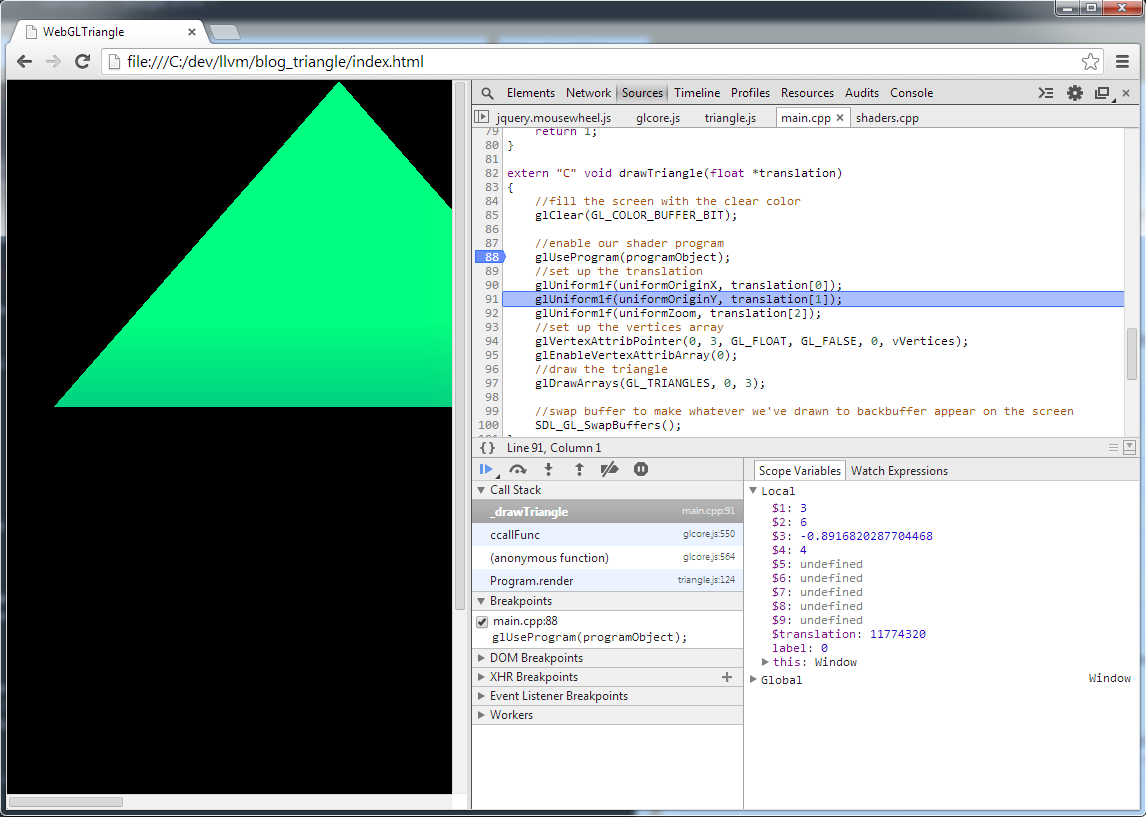 GLuint buildProgram(GLuint vertexShader, GLuint fragmentShader, const char * vertexPositionName);The main.cpp uses those to initialise the actual shaders. There are two functions in main.cpp: initGL initialises an SDL screen which in turn initialises the GL context, and drawTriangle (surprise!) draws a triangle. Note that there is no main entry point and in order to initialise the context and draw something, we actually need to call the two functions from somewhere. And that “somewhere” will be our JS code. The code is quite self-explanatory for those that have ever used OpenGL before.