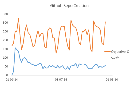 One other interesting difference is that Objective-C activity follows a clear weekly cycle, with the weekend seeing around half as many repos created compared to weekdays. Swift doesn’t appear to follow a strong weekly cycle, with Swift development being just as active on the weekend. Possibly an indication that people are primarily using Swift in their spare time?
