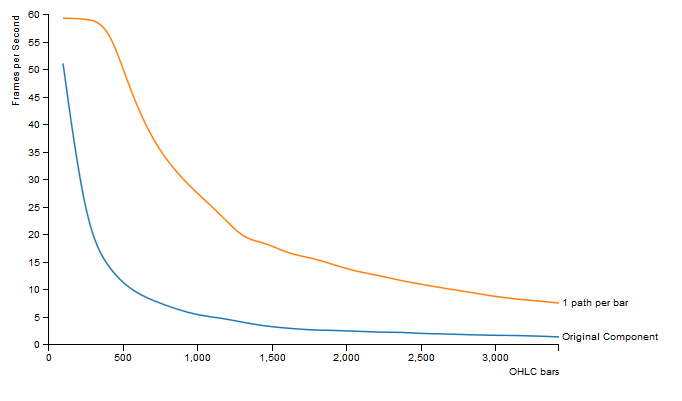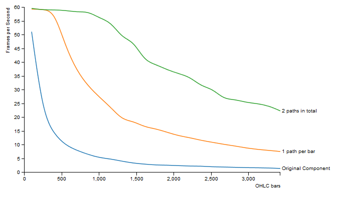 How does this chart perform when panning/zooming as the number of OHLC bars grows? Well, it’s a bit disappointing. The chart below shows the number of frames per second achieved when panning the chart in Google Chrome on a modern desktop computer against the number of OHLC bars on the chart. You can see that the number of frames per second drawn drops off quickly as the number of OHLC bars grows. This is because with SVG and semantic zooming, we have to update the attributes of every DOM node that makes up the OHLC series.