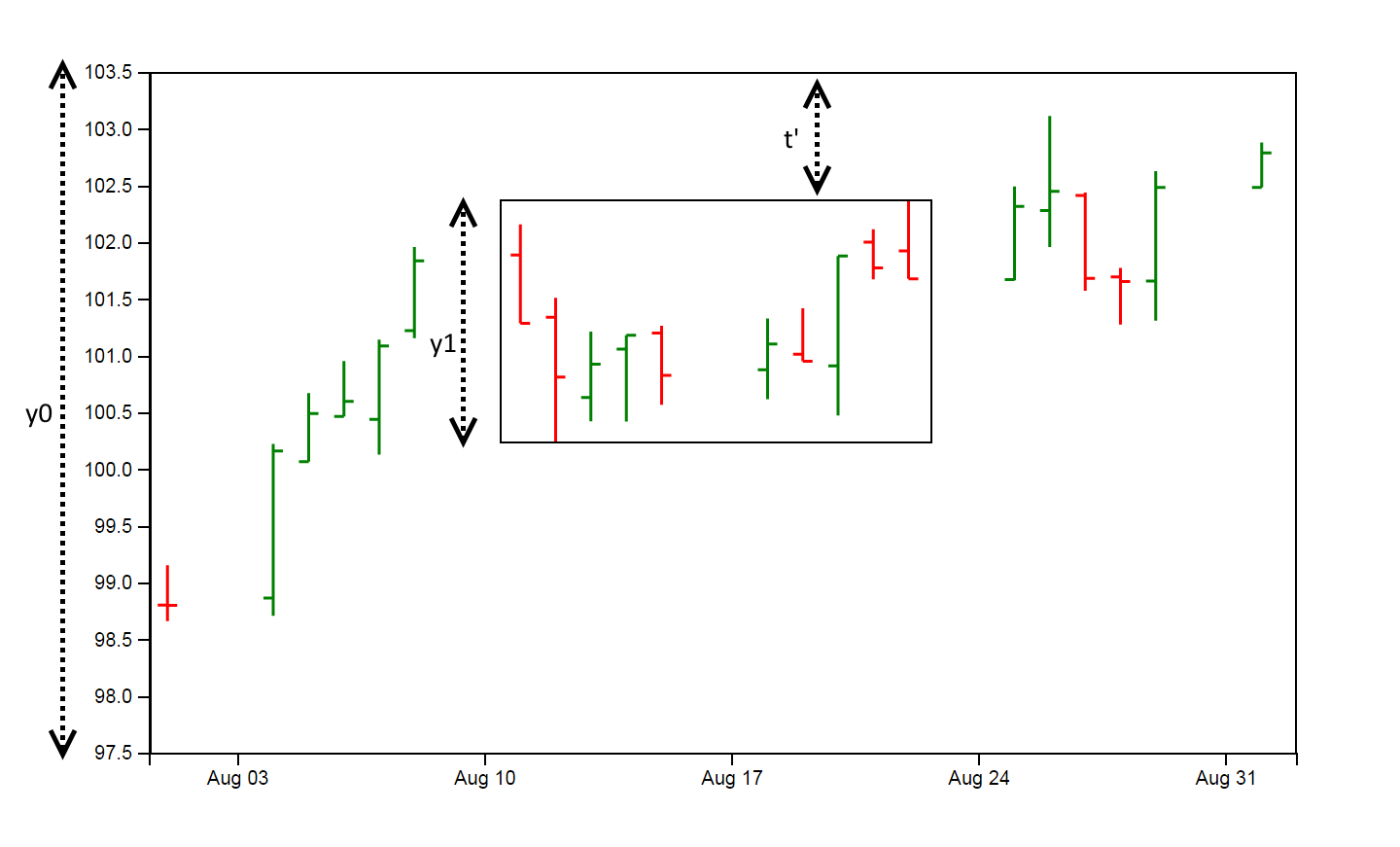 We’ll get this transformation with scale s and translate t by comparing the y-scale domain of this window to the y-scale domain of the original plotted series. The transformation’s scale is the ratio of the lengths of extents of the domains: s = y0/y1.