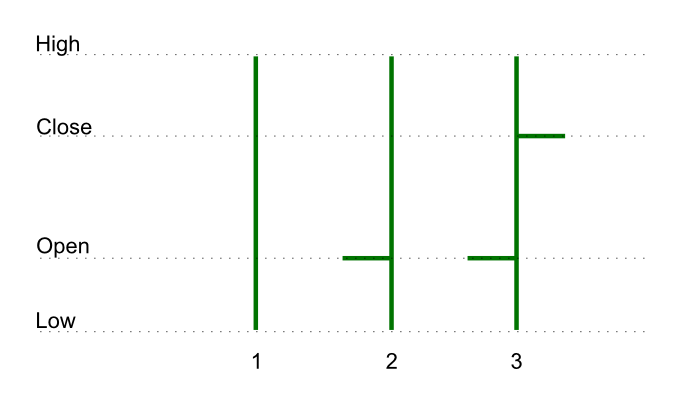 To draw an OHLC bar on paper, we could 1. Move a pen to the low price on a particular day and draw a vertical line to the high price 2. Move to the open price and draw a horizontal line to the left for the open tick 3. Move to the close price and draw a horizontal line to the right for the close tick.
