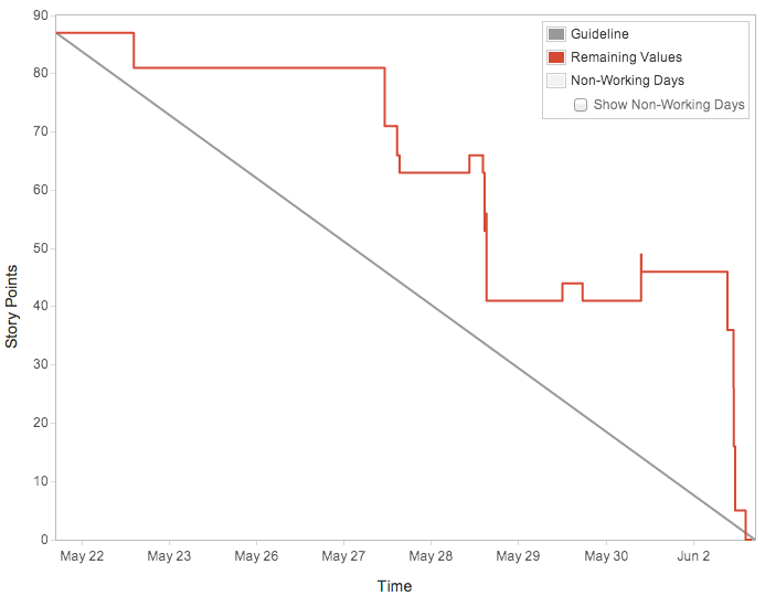 We introduced a formalised “Definition of Done”, where work was only considered “Done” when it was reviewed, tested, and approved by the Product Owner. To reflect this, we changed our burndown chart to plot Story Points instead of time - a story would only ‘burn-down’ when it reached the “Done” column.