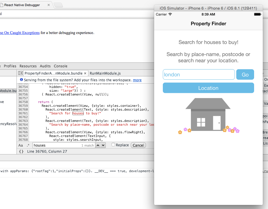 With React Native there is no need to rebuild the iOS application each time you make a change, simply Cmd+R to refresh just as if it were a browser. Even better, you can use Cmd+D to launch the Chrome Developer Tools: