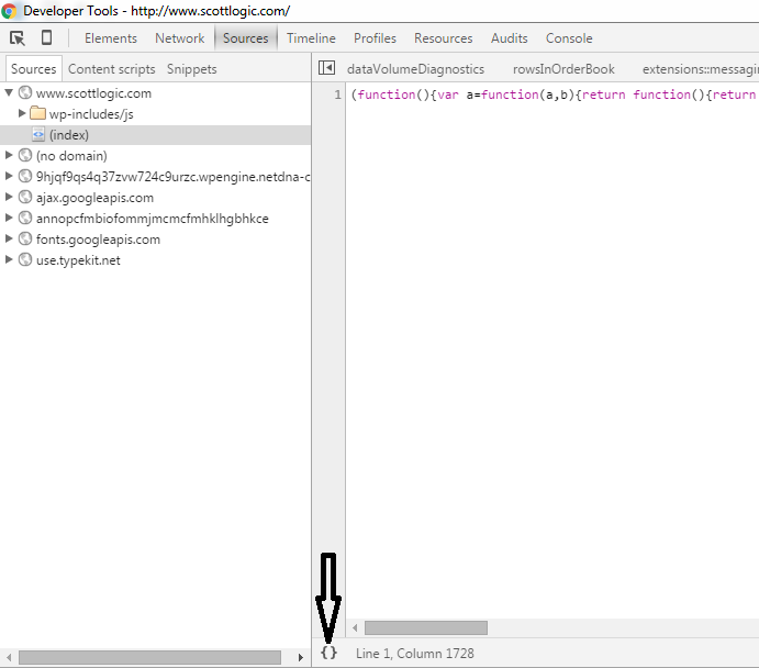 Pretty print: Minifying the javascript libraries make it load quicker in any browser but it’s also going to make it difficult to read. Fortunately, devTools has a pretty print mode which can make it readable again. All you have to do is to click the parenthesis.