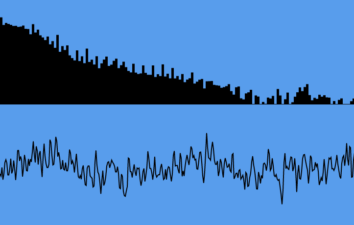 The frequency data is a tad more complex, as that’s commonly represented as a set of rectangles. It doesn’t make much sense to draw each frequency bin – usually the bin count is 1024. Even with a 1080p display, that leaves less than 2 pixels per bin. So, the number of bars displayed is proportional to the width of the browser, and the frequency data is then put into a reduced number of bins using a basic average reduction: