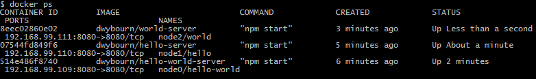 docker run -p 8080:8080 -d --name=hello-world --net=server-overlay-network dwybourn/hello-world-serverdocker run -p 8080:8080 -d --name=hello --net=server-overlay-network dwybourn/hello-serverdocker run -p 8080:8080 -d --name=world --net=server-overlay-network dwybourn/world-server