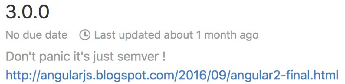 One month ago when the team started to talk about releasing Angular 3 in early 2017, in anticipation of the panic, a number of people very quickly published posts telling people not to worry this was not going to be an Angular 1 to 2 style transition.