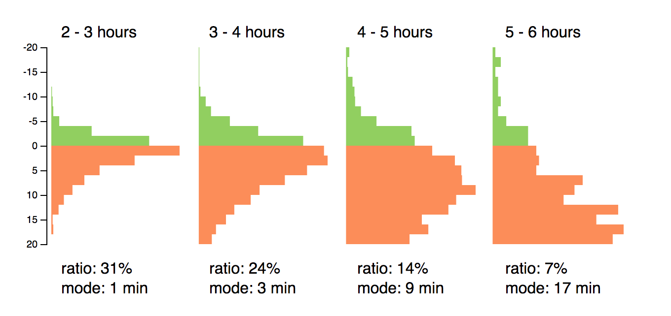 The following small-multiples chart shows the split distribution for runners that finished within hour intervals:
