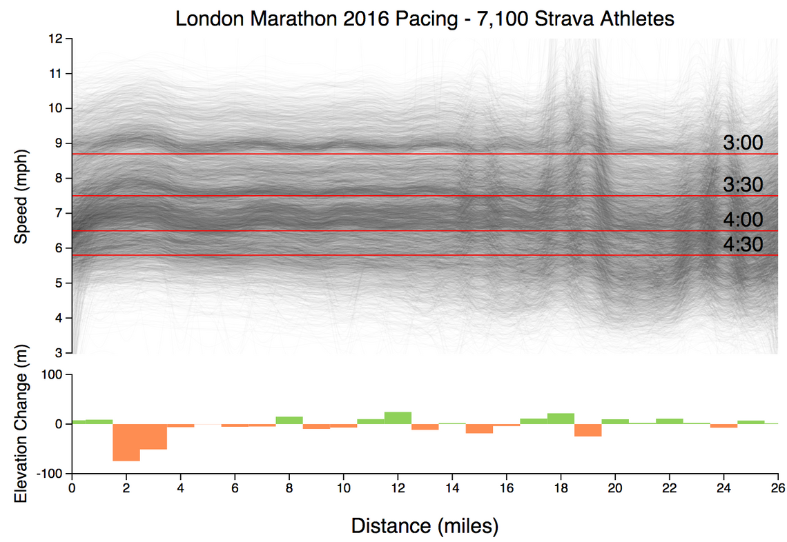 4. Something funny goes on around mile 18-19, with many athletes making a change in pace, some faster, some slower. This could be due to elevation changes, which although minor, have a bigger impact on fatigued runners. Or, perhaps it is due to GPS inaccuracies? This part of the course takes runners through Canary Wharf, which has many high buildings.