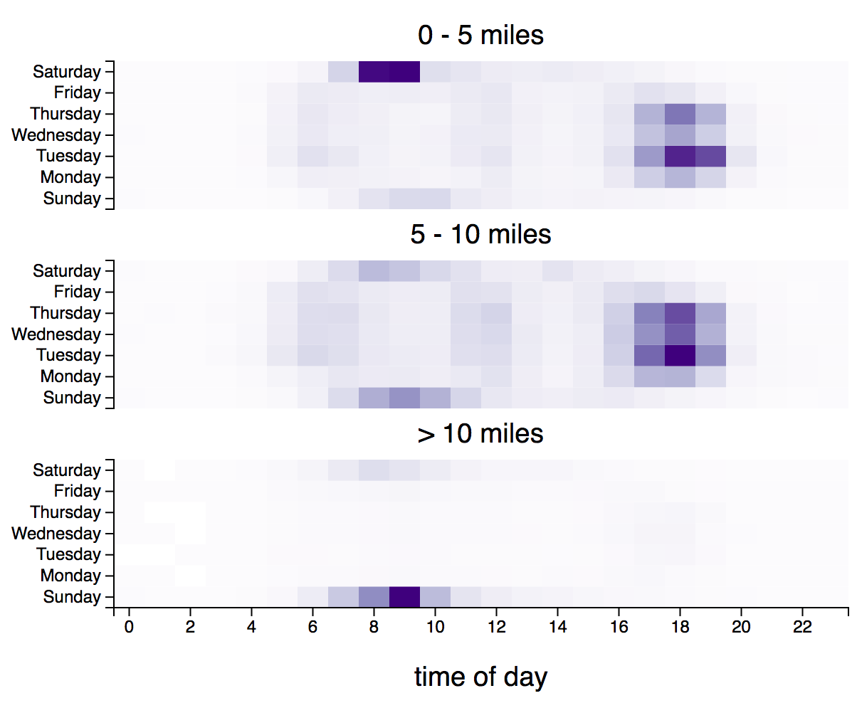 The Saturday morning peak in the 0-5 mile category confirms that parkruns are a very popular part of people’s weekly running routine. Mid-distance runs, of a 5-10 mile distance are typically run on Tuesdays-to-Thursdays at 18:00. And finally, long runs are almost exclusively a Sunday morning pursuit.