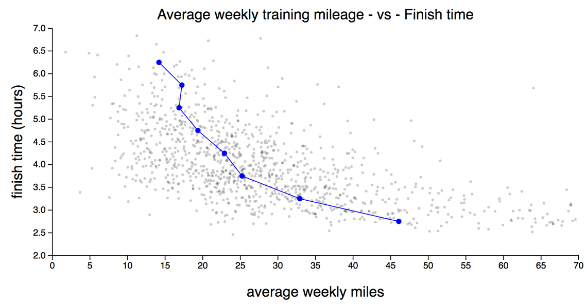 The following chart takes a closer look at the relationship between finish time and weekly mileage, with the training data from the 1,000 athletes rendered as a scatter chart. The solid line shows the average weekly miles, by finish time, bucketed by 30 minute intervals.