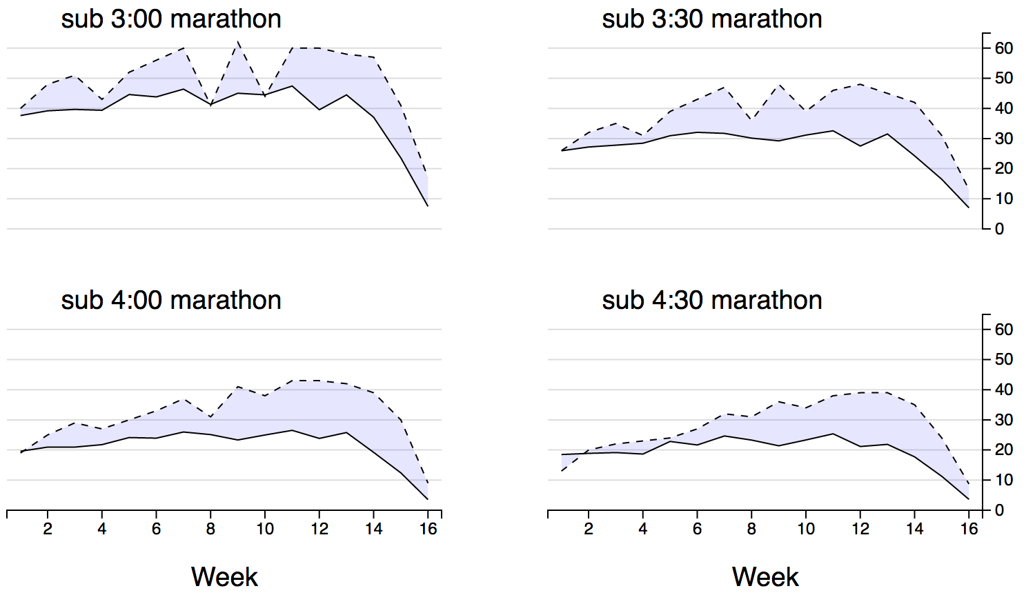 The popular Runners World website has a ‘Big Marathon Index’, with training plans for a wide range of target finish times. I picked four of these (3:00, 3:30, 4:00, 4:30) to see how the weekly prescribed mileage differs form the way these 1,000 athletes actually trained.