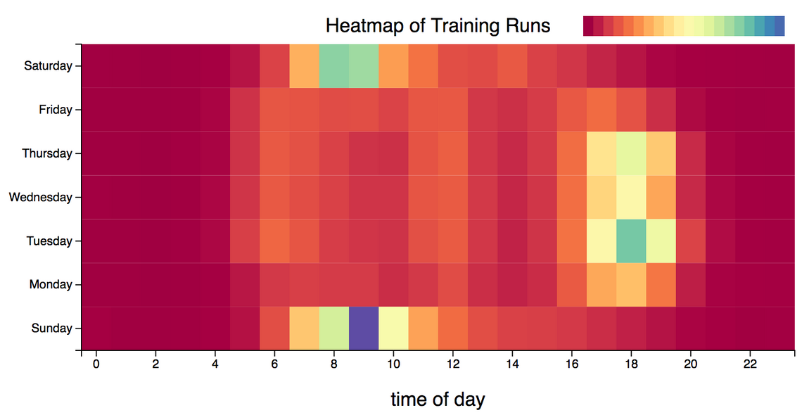 By looking at when athlete log runs I found that Sunday was the most popular training day, however, a more detailed heatmap of runs, showing the time and day of week, reveals some really interesting patterns: