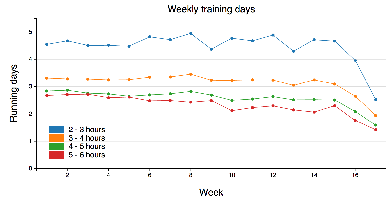 Week 17 is the week of the marathon, and the mileage plotted in that week excludes the marathon itself.