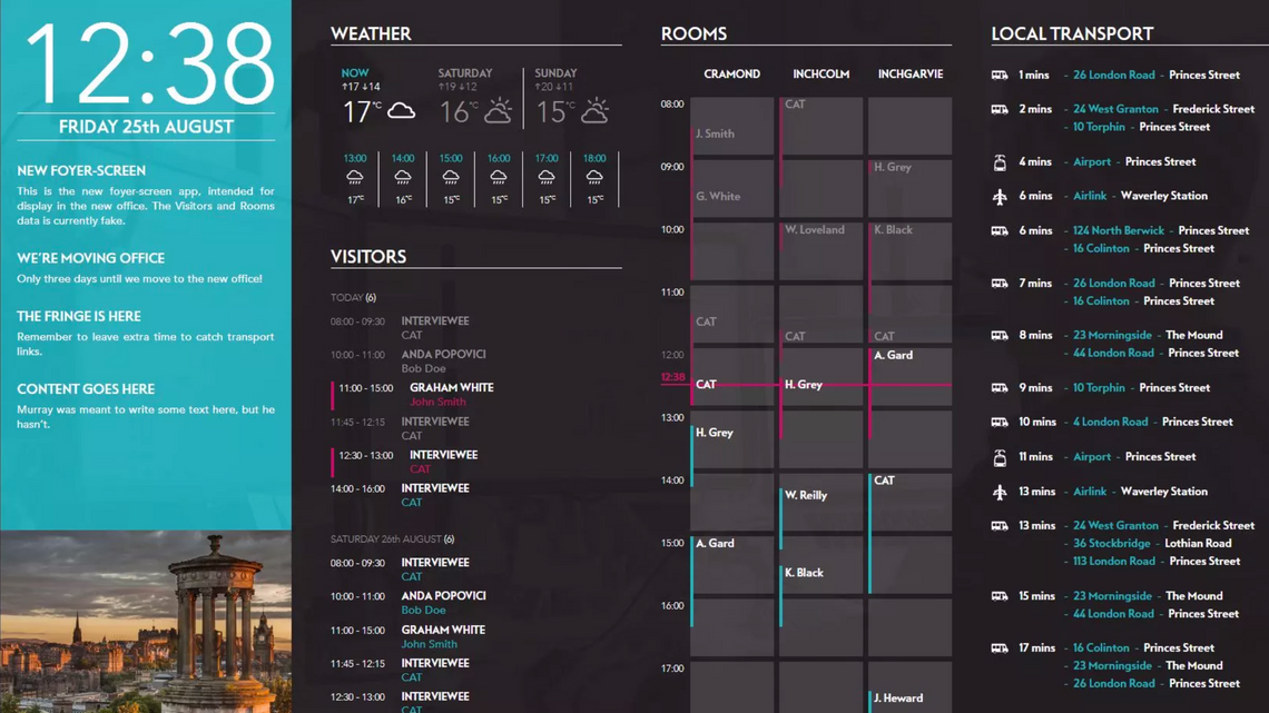We were tasked with creating a Foyer Screen which would show pertinent information for the office it is in, such as room availability, visitors, local weather, notes, and travel information.
