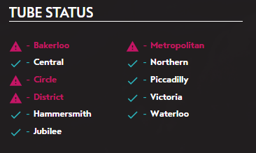 Another challenge that arose as we worked on transport, was that the original design was created specifically for Edinburgh. However, by the time we were working on transport the scope had expanded so that, if they wanted to, any other office could use the screen as well. For London, this proved to be a bit of a challenge as they had different types of public transport that we felt we had to display in a unique way, notably the tube. Eventually, we settled on having a tube status section at the bottom of the transport column that would give a visual indication if something was not operating as expected on one of the lines.