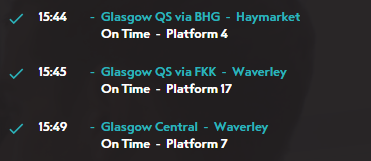 The solution we settled on was to allow the offices to select multiple destinations as part of a route, which our system will then compare against all the trains leaving a given station. If the train matches multiple routes, we then select the route with the broadest definition. For example, a train going to Glasgow that stops at Falkirk will match both the “Glasgow via Falkirk” route and the “Glasgow” route. In this example, “Glasgow via Falkirk” would be the name displayed, as it shows the most descriptive name. Below is an example Route config object.