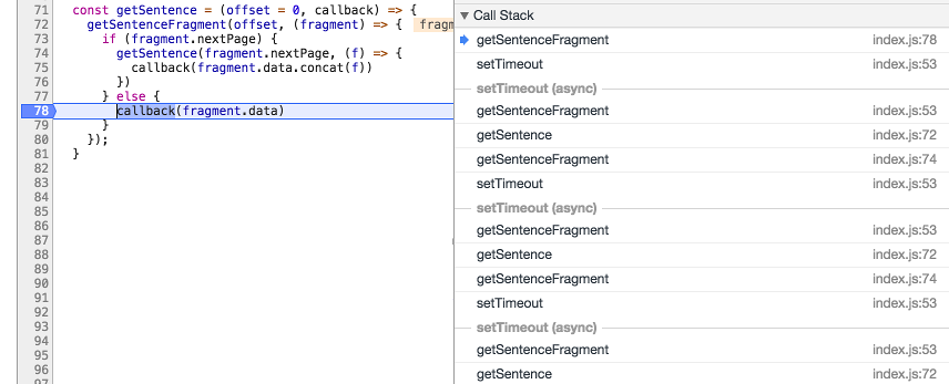 And now for the other branch, where there is another page to fetch, which is where the function is invoked recursively. Here we invoke getSentence, however, it returns asynchronously, so we need another callback, where the concatenation takes place..