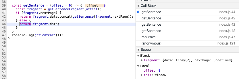 With the Chrome debugging tools, by breaking on the termination condition you can see four invocations of this function. You can also navigate up and down the stack to see the fragment and offset values that are within scope on each invocation: