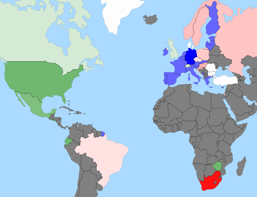 .attr('fill', d => colorScale(country.properties.rates.change)));We now have a coloured map, but there are a few cases which are better coloured differently: the base country, countries which have the same currency as the base country, and countries for which we don’t have data. To do this, we wrap the scale in a method to deal with each case (the template method countryCharacteristic is used to extract the conditionals; this is also used to set informative tooltips on each country):