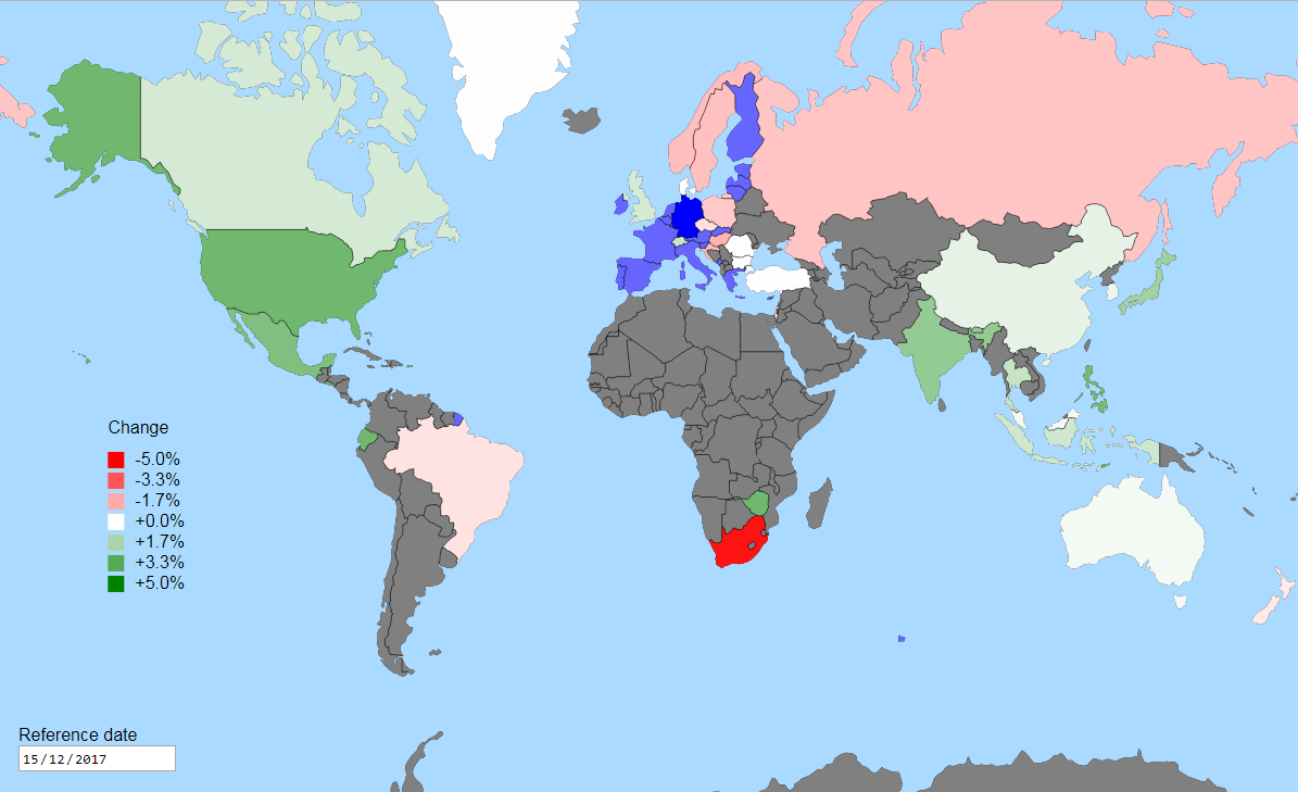 In this post, I’ll describe how I used D3 and free currency exchange data to create an interactive map of relative changes in currency strength. The end result is an interactive world map where you can select your base country and reference (past) date, to view which countries’ currencies have strengthened or weakened since that date.