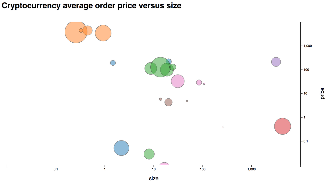 Our d3fc project has a number of D3 components which make it easy to create bespoke charts. The following code uses the to_colums method from the Perspective view to access the computed view. It uses the d3fc point series, and chart components to create a scatter plot. Additional D3 scales are used for determining the colour of each point, from the base currency, and the size, based on the total number of orders: