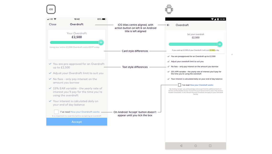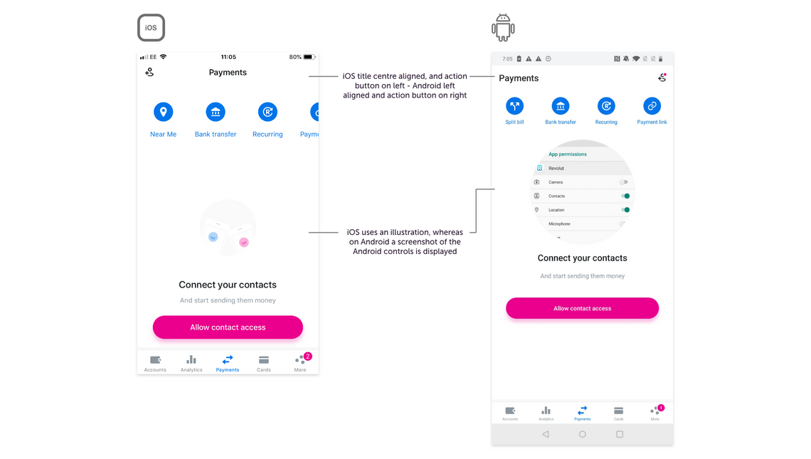 At one end, there is the goal of ‘Platform Parity’ where the aim is to maintain the exact same features and visual language/feel across both their iOS and Android apps. This may involve creating custom components so that they can maintain this consistency. At the other end of the scale is the goal of ‘Platform specific design’. The features, flows and components in products adhering to this approach would mirror the technology available in each platform. This usually focuses more heavily on the use of iOS Human Interface Guidelines and Google Material Design native components.