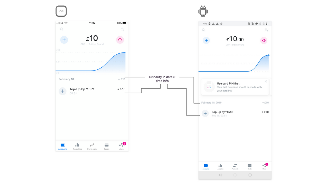 With platform parity there is often a skew towards iOS being designated as the ‘main’ app or the main design language. This means that the design boundaries in Android are often heavily influenced by iOS. There are many reasons why this might be the case: