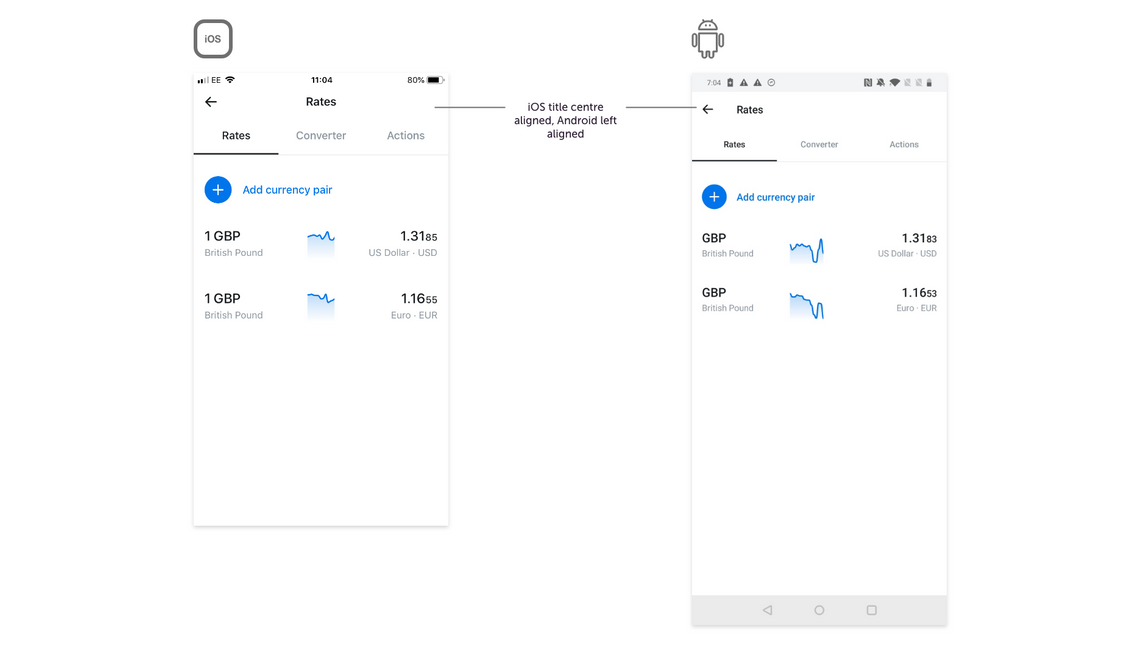 There are however, some small considerations that appear to have been made to the cross-platform differences. On the ‘Rates’ screen the tab view is laid out relative to the native platform guidelines, with the iOS page title centered, and the Android title right aligned. A similar example can be seen below where the ‘Add Contact’ action button is left aligned on iOS and right aligned on Android, again relating to the platform guidelines. These are small considerations, but likely make a big impact on the way users interact with the application based on their familiarity with where components can be found.