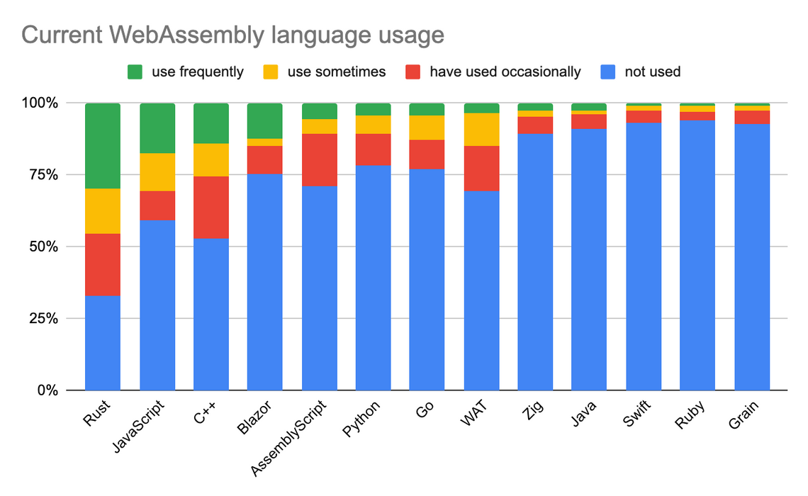 This year 67% of respondents are frequently using WebAssembly, which is a big jump from 47% last year.