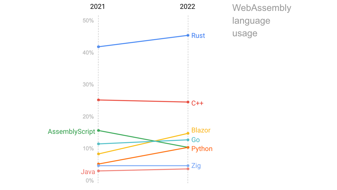 The use of WebAssembly for serverless and containerisation has climbed. If you want to know why WebAssembly is such a significant technology for these applications, I’d recommend tha article, Pay Attention to WebAssembly, or When WebAssembly Replaces Docker which coves the various talks at Kubecon this year.