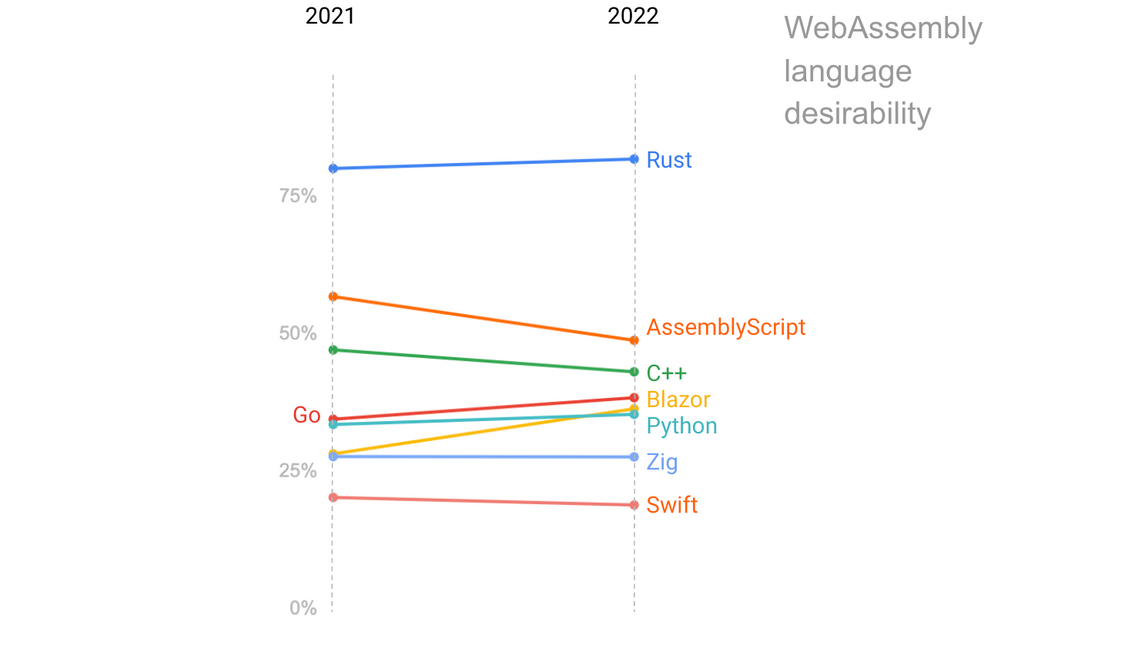 This shows that Rust usage has climbed steadily, but the biggest climbers are Blazor and Python. It’s certainly been a big year for Python, with the launch of Pyscript, an interactive online playground. AssemblyScript has had the biggest fall in usage, which surprised me a little. I do wonder whether some respondents are incorrectly identifying AssemblyScript as JavaScript?