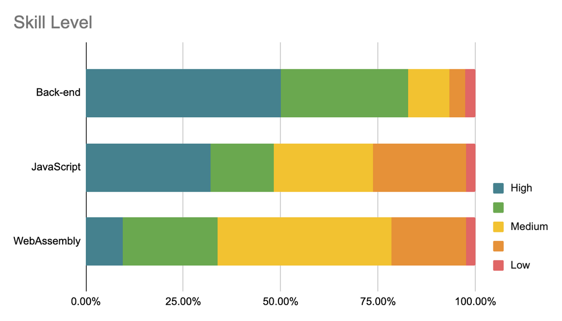 Respondents were asked to declare their skill level in JavaScript, Back-end and WebAssembly development: